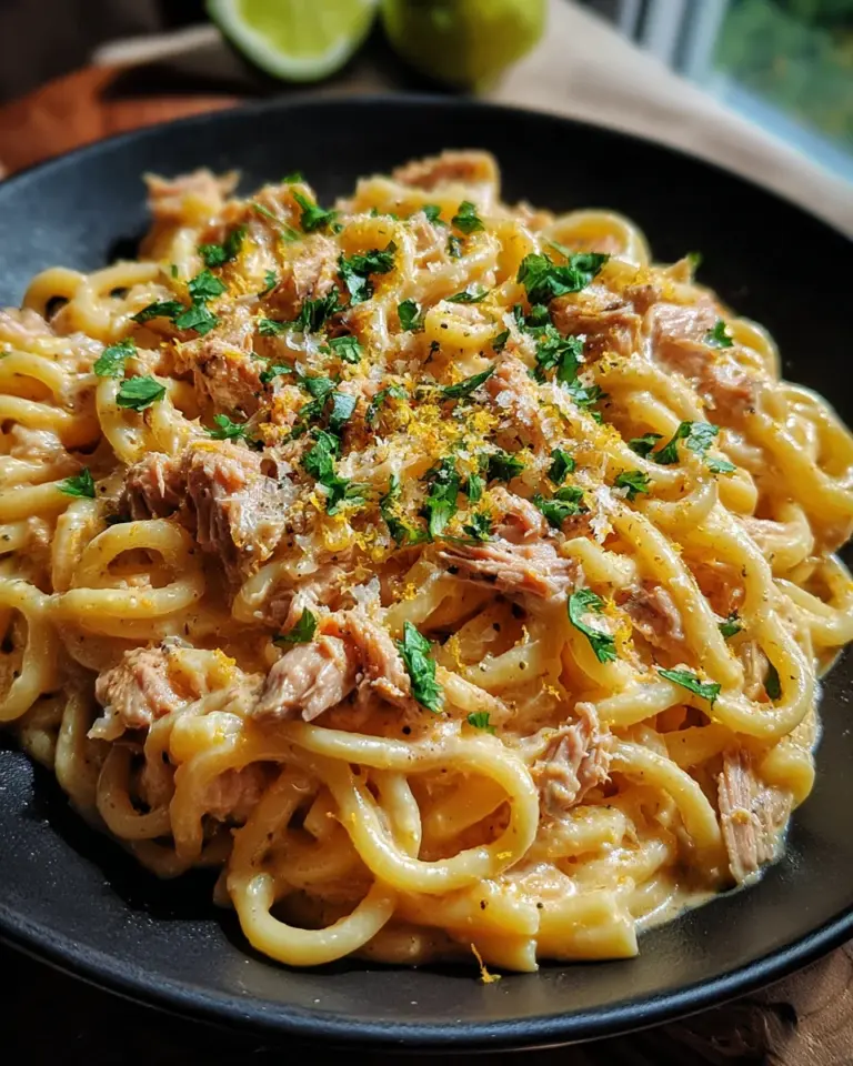 Sobald die Pasta “al dente” ist und die Sauce die gewünschte Konsistenz hat, nehmen Sie den Topf vom Herd. Heben Sie den abgetropften Thunfisch vorsichtig unter. Fügen Sie den Abrieb einer halben Zitrone und eine Handvoll frisch geriebenen Parmesan hinzu. Die Restwärme reicht aus, um den Fisch zu erwärmen, ohne ihn auszutrocknen.