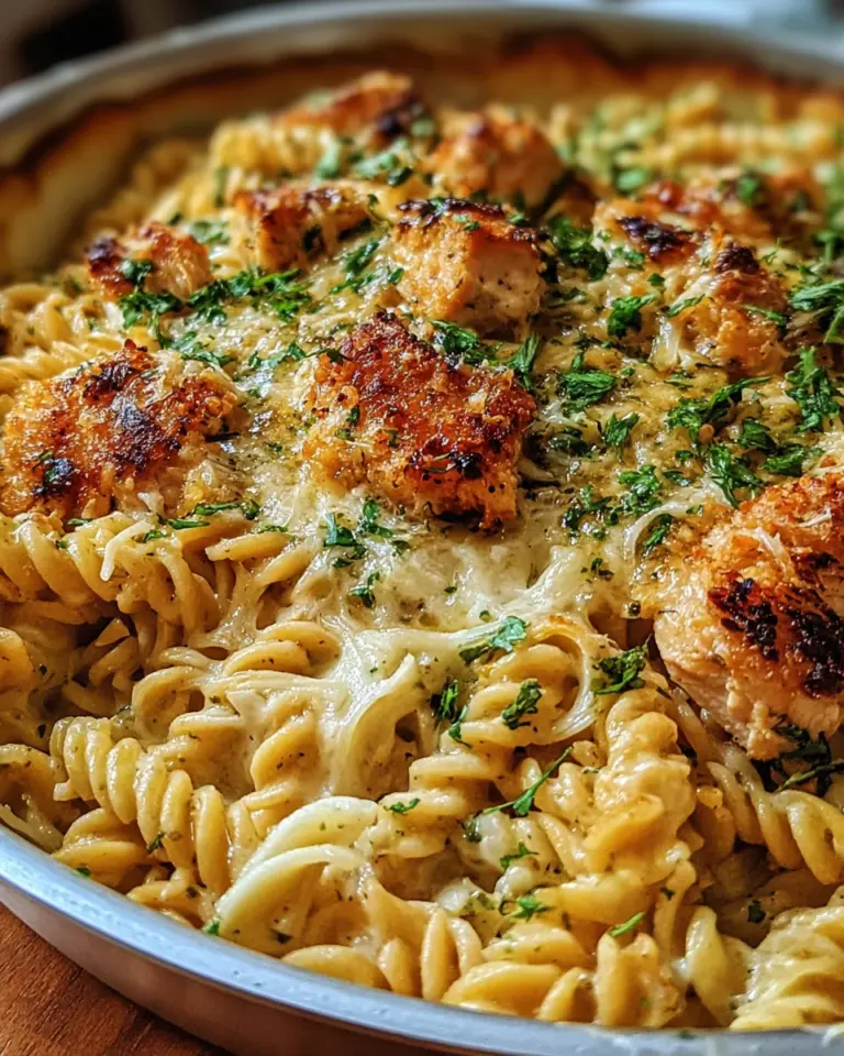 | Hauptzutaten | Hähnchenbrust, kurze Pasta (Penne/Fusilli), viel Knoblauch, Parmesan, Panko-Brösel, Sahne. |