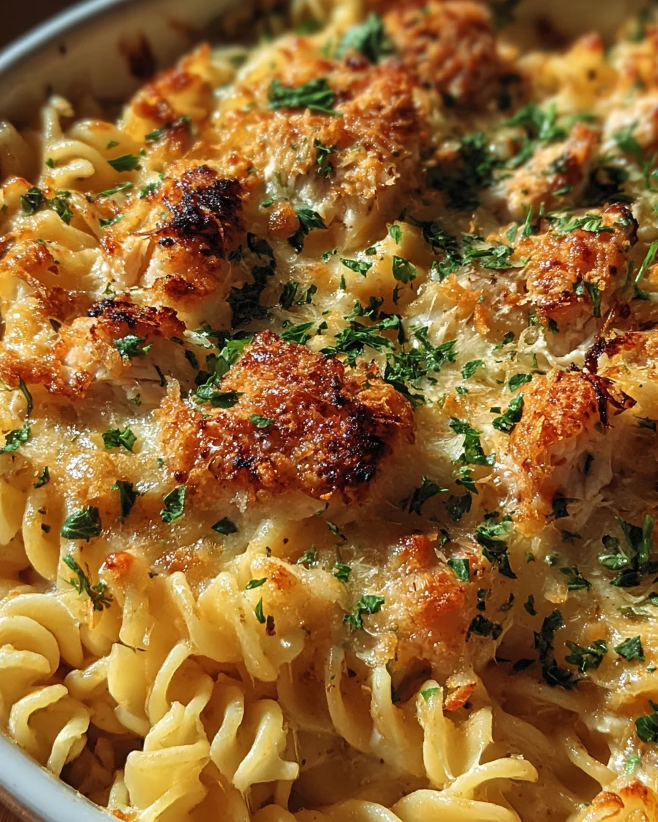 Mischen Sie Pasta, Hähnchen und Sauce in einer eingefetteten Auflaufform. Bestreuen Sie alles großzügig mit einer Mischung aus Panko-Bröseln, restlichem Parmesan und gehackter Petersilie. Backen Sie den Auflauf bei 200°C Ober-/Unterhitze für ca. 20-25 Minuten, bis die Kruste goldbraun und knusprig ist.